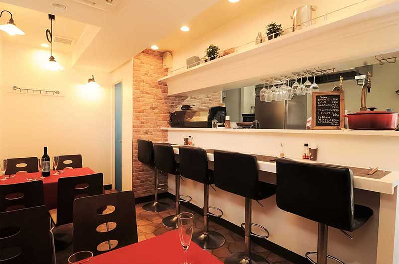 店内は、白の壁紙を基調に、赤いテーブルクロスが映えるインテリア。アットホームな雰囲気で、お一人でのお食事やお酒も気兼ねなくできます。地元の皆様に愛される家庭的なバルを目指しております。ぜひお気軽にご来店ください。